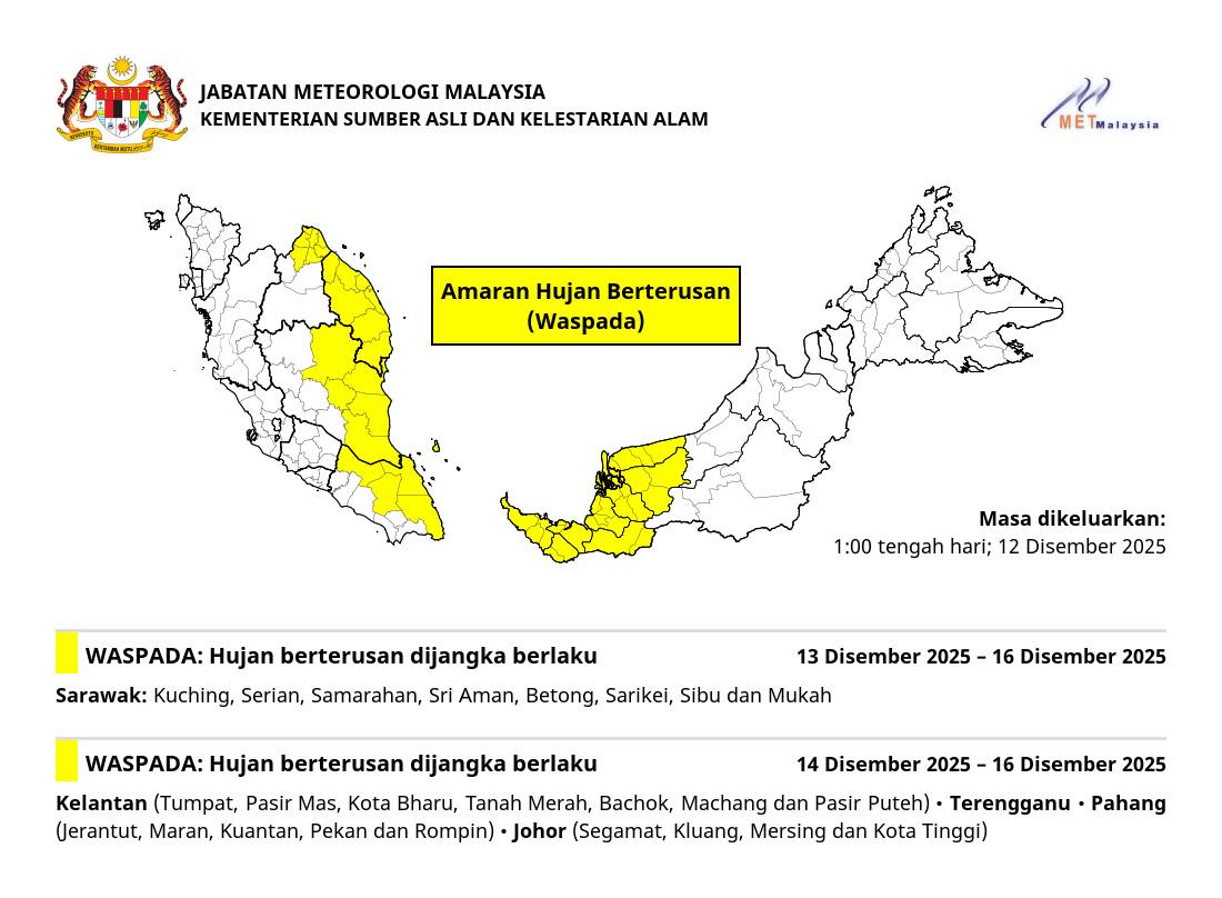 Hujan berterusan diramal melanda beberapa kawasan di Sarawak, Kelantan, Terengganu, Pahang... more