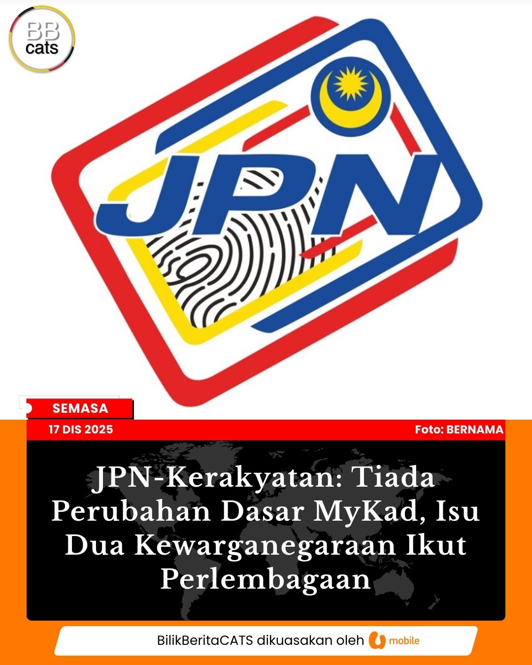 Jabatan Pendaftaran Negara menegaskan tiada perubahan dasar MyKad berkaitan isu dua kewarganegaraan Read more...